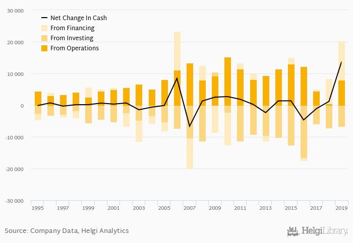 Cash from financing amounted to SEK 12,492 mil, so the company generated SEK 13,759 mil net cash in 2019.