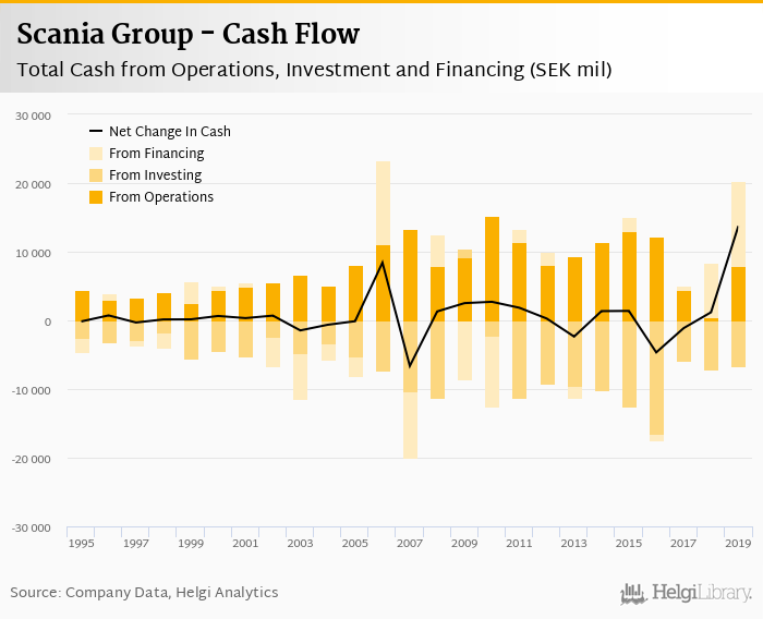Scania Group's operating cash flow stood at SEK 7,876 mil in 2019, up 1% when compared to the previous year. Historically, between 1995 - 2019, the firm’s operating cash flow reached a high of SEK 15,301 mil in 2010 and a low of SEK 408 mil in 2018.