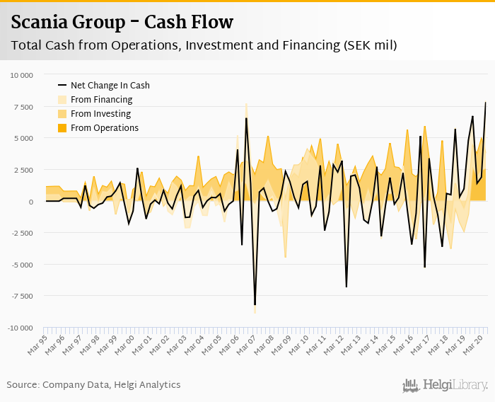 Scania Group's operating cash flow stood at SEK 3,755 mil in 2Q2020, up 673% when compared to the previous year. Historically, between 1Q1995 - 2Q2020, the firm’s operating cash flow reached a high of SEK 5,888 mil in 4Q2016 and a low of SEK -1,792 mil in 2Q2018.