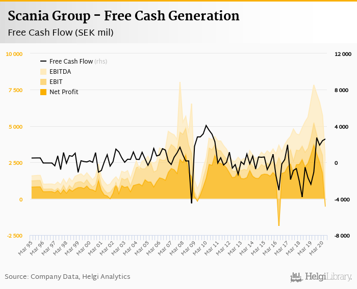 Scania Group made a net profit of SEK -544 mil with revenues of SEK 25,418 mil in 2Q2020, down by 115% and down by 38.3%, respectively, compared to the previous year. This translates into a net margin of -2.14%.