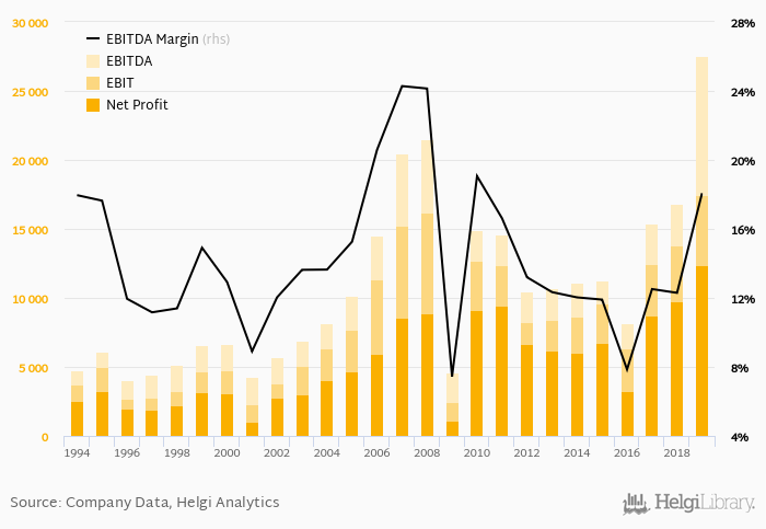 Historically, between 1994 - 2019, the firm’s net profit reached a high of SEK 12,381 mil in 2019 and a low of SEK 1,048 mil in 2001. Since 2014, the firm's net profit has increased 106% or 15.5% a year on average.
