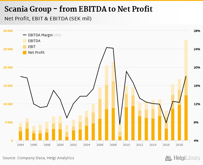 Scania Group made a net profit of SEK 12,381 mil with revenues of SEK 152,419 mil in 2019, up by 27.2% and up by 11.2%, respectively, compared to the previous year. This translates into a net margin of 8.12%.