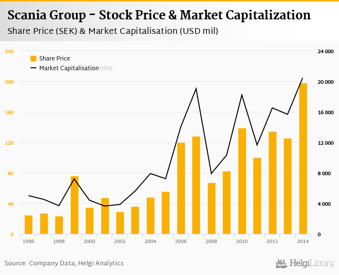 Scania Group stock traded at SEK 198 per share at the end 2014 implying a market capitalization of USD 20,510 mil.