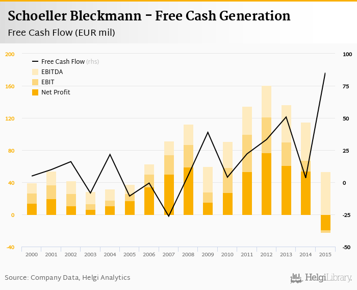 Schoeller Bleckmann made a net profit of EUR -19.0 mil with revenues of EUR 314 mil in 2015, down by 135% and down by 35.8%, respectively, compared to the previous year. This translates into a net margin of -6.05%.