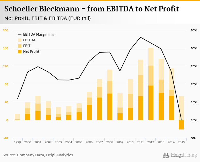 Schoeller Bleckmann made a net profit of EUR -19.0 mil with revenues of EUR 314 mil in 2015, down by 135% and down by 35.8%, respectively, compared to the previous year. This translates into a net margin of -6.05%.
