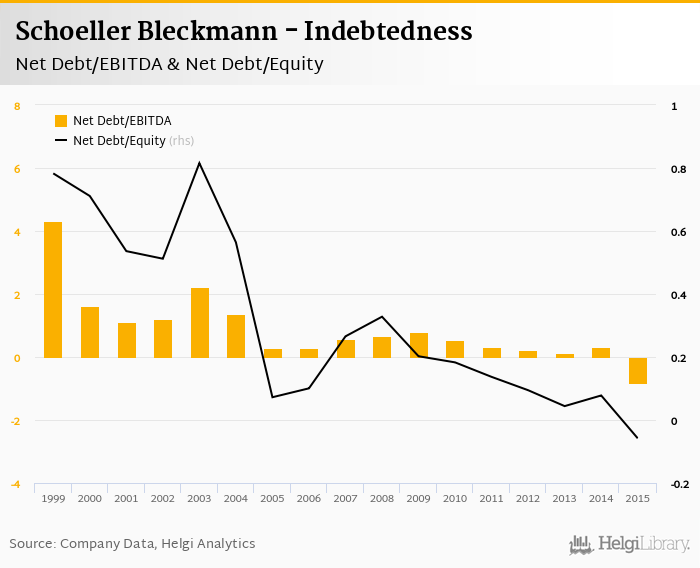 Schoeller Bleckmann's net debt stood at EUR -26.2 mil and accounted for -0.058 of equity at the end of 2015. The ratio is down 0.136 pp compared to the previous year.