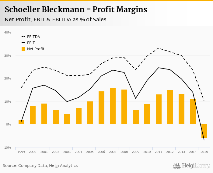 Schoeller Bleckmann made a net profit of EUR -19.0 mil with revenues of EUR 314 mil in 2015, down by 135% and down by 35.8%, respectively, compared to the previous year.