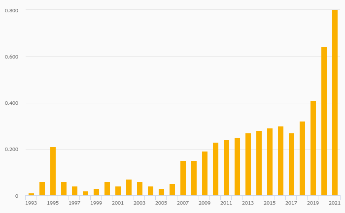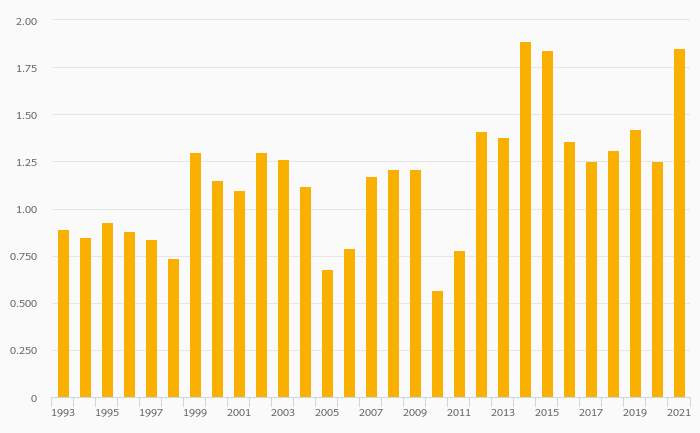 Cocoa Bean Consumption Per Capita rose 48.0% to 1.85 kg in Slovakia in 2021