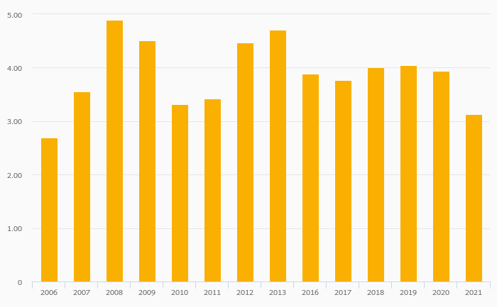 Cocoa Bean Consumption Per Capita fell 20.6% to 3.13 kg in Montenegro in 2021