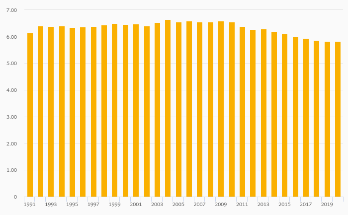 Employers, Male (As % of Employment) fell 0.086% to 5.82% in the European Union in 2020