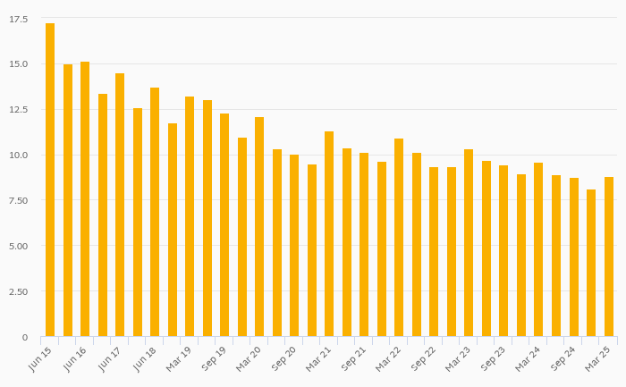 Bank Pre-Tax Return on Equity (Pre-Tax ROE) fell 7.79% yoy to 8.82% in China in 1Q2025