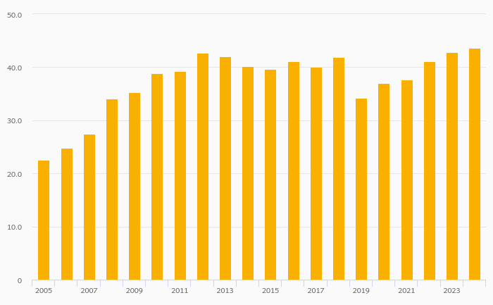 Bank Liquid Assets (As % of Short-Term Liabilities) rose 1.88% to 43.6% in Australia in 2024