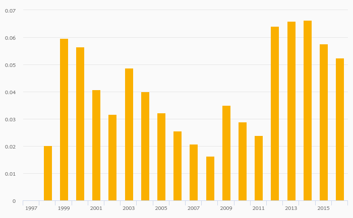 Wind Capacity (As % of Worldwide Wind Turbine Capacity) fell 8.95% to 0.052% in Tunisia in 2016