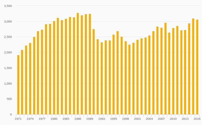 Electric Power Production Per Capita fell 1.26% to 3,061 kWh in Romania in 2016