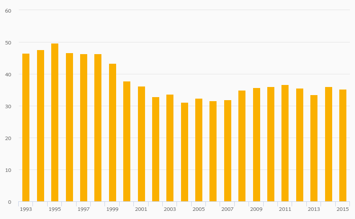Agriculture, Value Added (As % of GDP) fell 2.31% to 35.3% in Cambodia in 2015