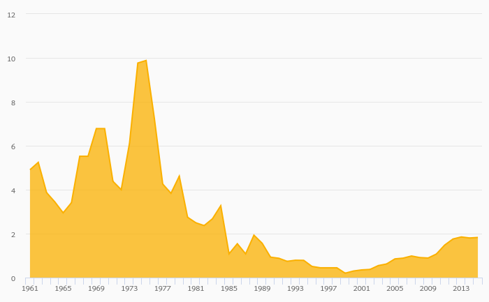 Agriculture, Value Added (As % of GDP) fell 3.03% to 1.23% in Oman in 2015