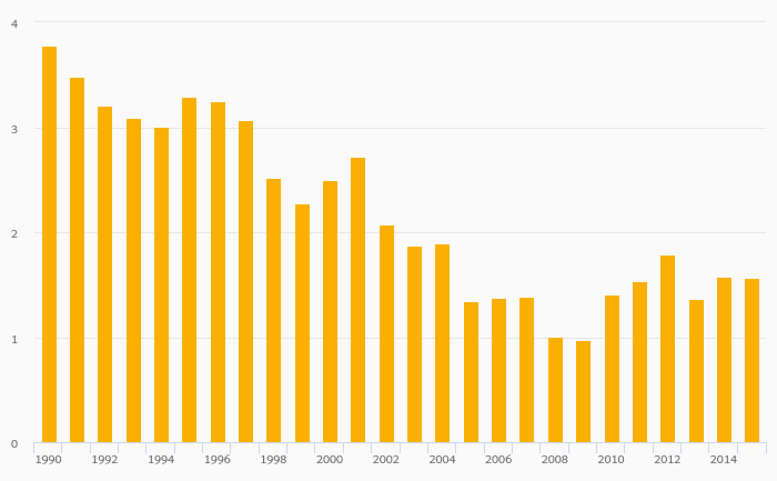 Agriculture, Value Added (As % of GDP) fell 0.858% to 1.56% in Denmark in 2015