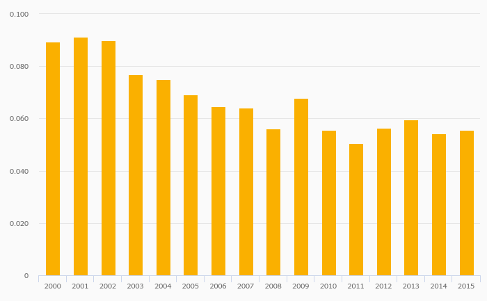 Agriculture, Value Added (As % of GDP) rose 2.43% to 0.056% in Hong Kong in 2015