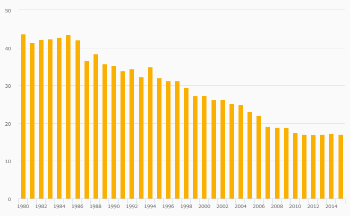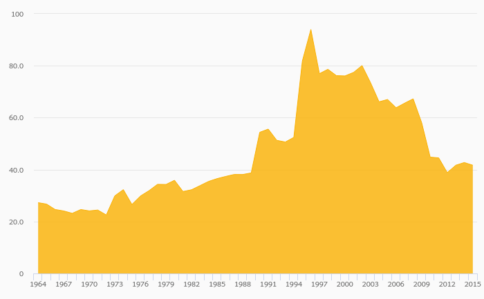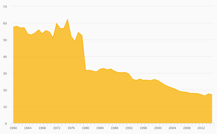 Agriculture, Value Added (As % of GDP) fell 2.43% to 41.7% in Liberia in 2015