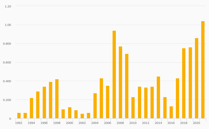 Cocoa Bean Consumption Per Capita rose 20.9% to 1.04 kg in Ukraine in 2021