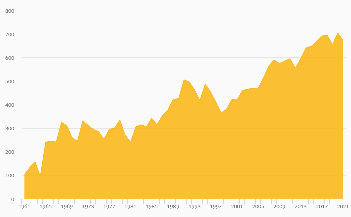Banana Consumption (Total) fell 4.40% to 673 kt in Italy in 2021