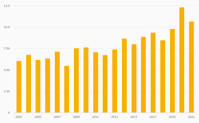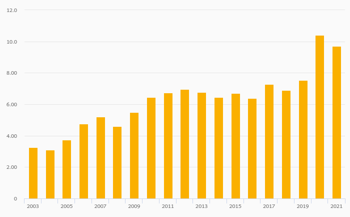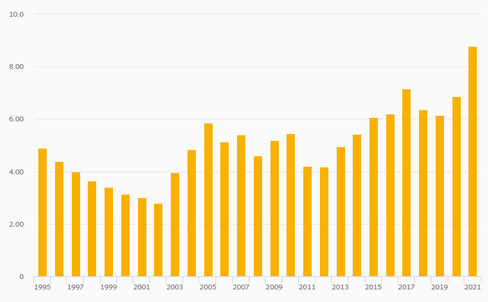 Households' Assets In Investment Funds (As % of GDP) rose 27.7% to 8.77% in Slovakia in 2021