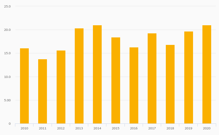 Households' Assets In Investment Funds (As % of GDP) rose 6.78% to 21.0% in Israel in 2020