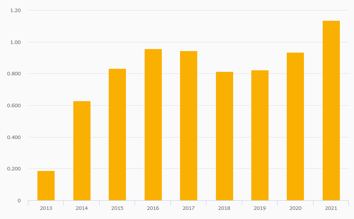 Households' Assets In Investment Funds (As % of GDP) rose 21.4% to 1.14% in Ireland in 2021