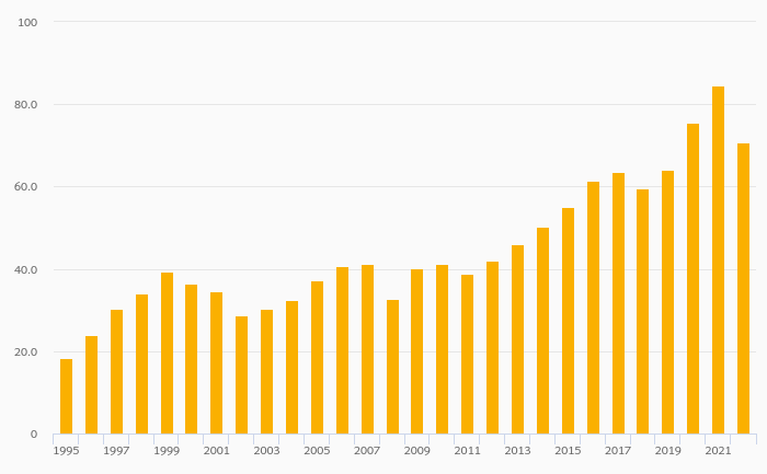 Households' Assets In Investment Funds (As % of GDP) fell 16.5% to 70.6% in Canada in 2022