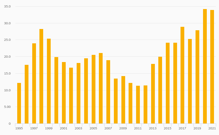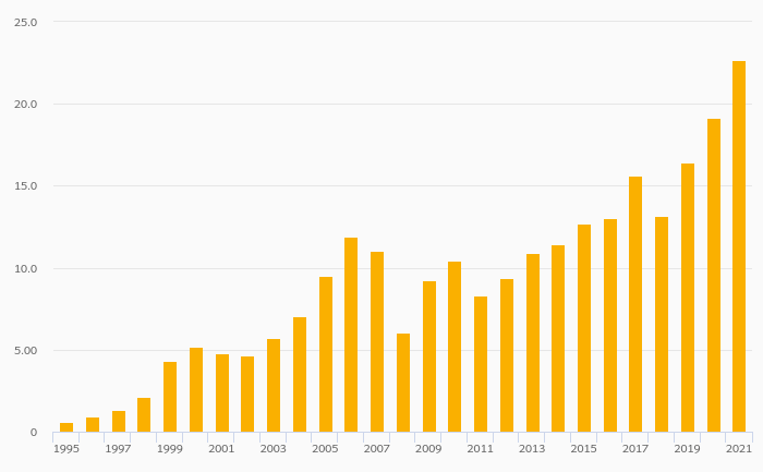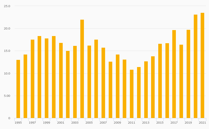 Households' Assets In Investment Funds (As % of GDP) rose 18.4% to 22.6% in Finland in 2021