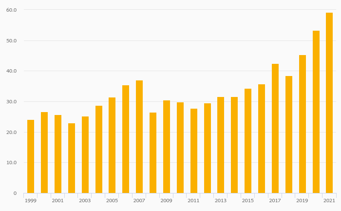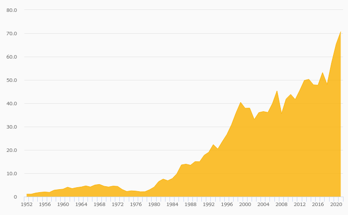 Households' Assets In Investment Funds (As % of GDP) rose 8.14% to 70.7% in the USA in 2021