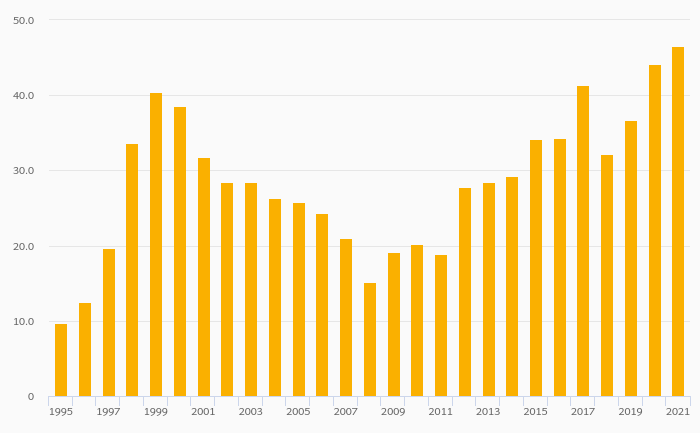 Households' Assets In Investment Funds (As % of GDP) rose 5.57% to 46.6% in Italy in 2021