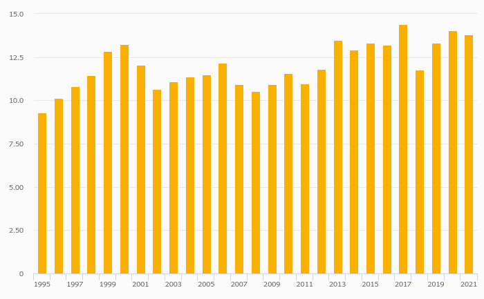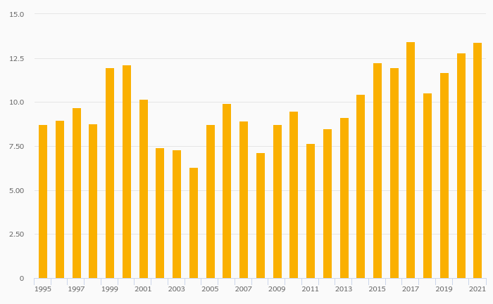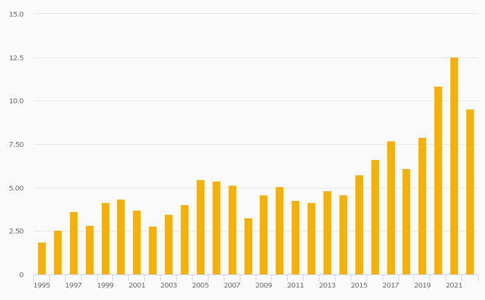 Households' Assets In Investment Funds (As % of GDP) fell 23.9% to 9.52% in Norway in 2022