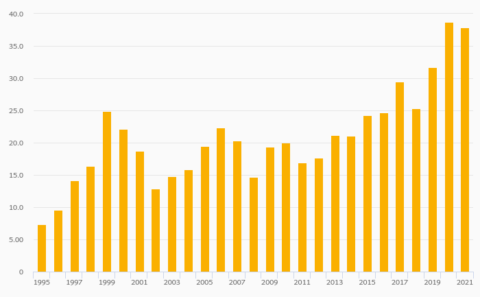 Households' Assets In Investment Funds (As % of GDP) fell 1.98% to 37.9% in Sweden in 2021