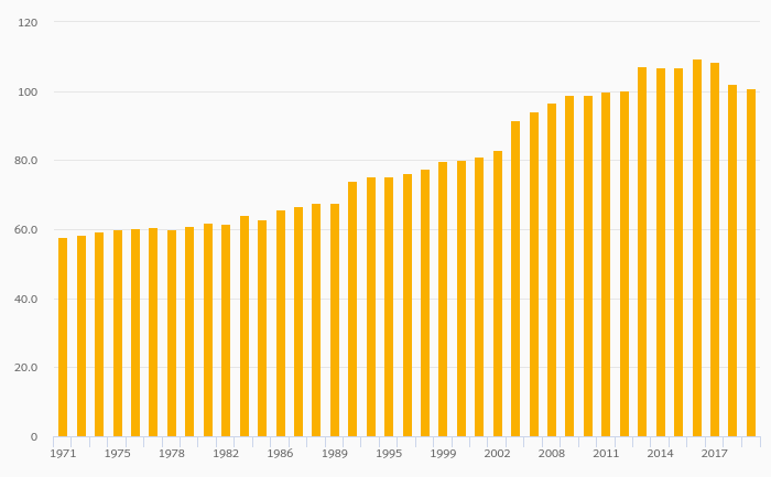 Girls to Boys In Primary and Secondary Education rose 1.73% to 99.0% in Moldova in 2020