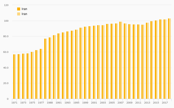 Girls to Boys In Primary and Secondary Education rose 0% to 103% in Iran in 2020
