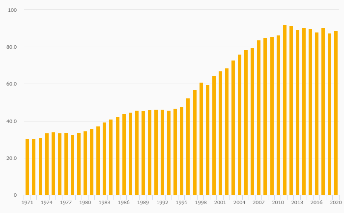 Gross School Enrollment, Female (Primary Education) rose 1.52% to 88.9% in Senegal in 2020