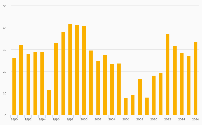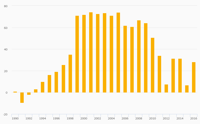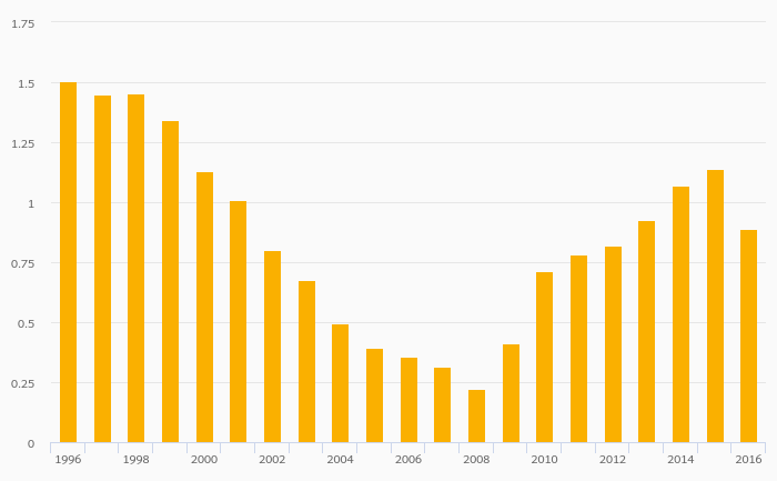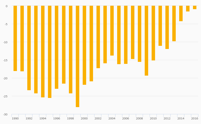 Energy Dependence (Hard Coal & Derivatives) rose 40.0% to -0.900% in the Czech Republic in 2016