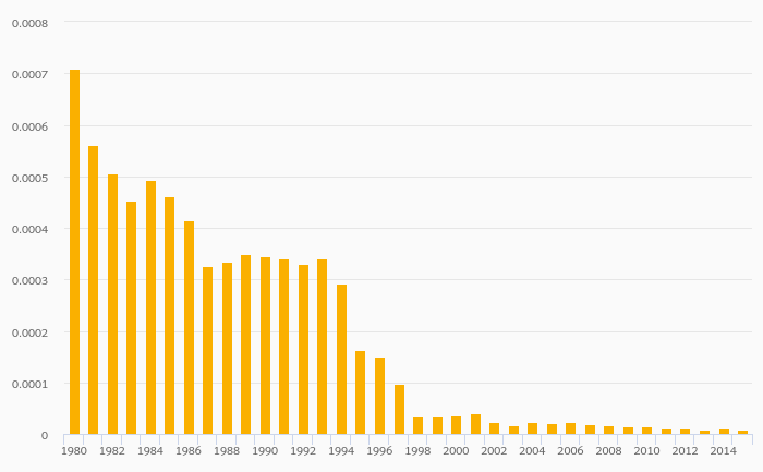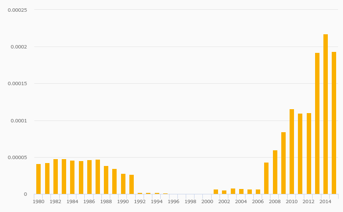 Hard Coal Production (As % of Worldwide Production) fell 11.2% to < 0.001% in Afghanistan in 2015