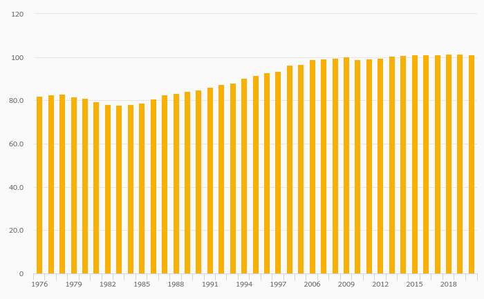 Girls to Boys In Primary and Secondary Education rose 1.73% to 99.0% in Moldova in 2020