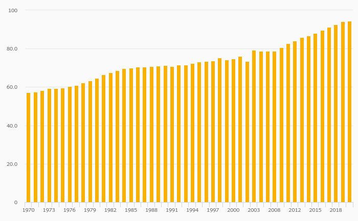 Girls to Boys In Primary and Secondary Education rose 0.596% to 95.7% in Laos in 2020