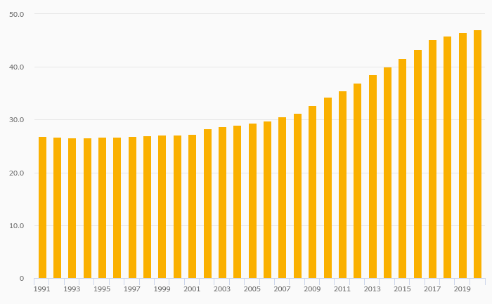 Employees In Services, Male (As % of Male Employment) rose 1.15% to 47.1% in Afghanistan in 2020
