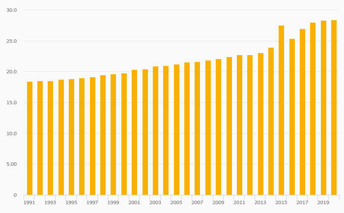 Employees In Services, Male (As % of Male Employment) rose 0.300% to 28.4% in Mali in 2020