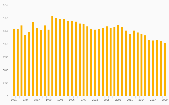 Employees In Industry, Female (As % of Female Employment) fell 2.79% to 10.3% in Brazil in 2020