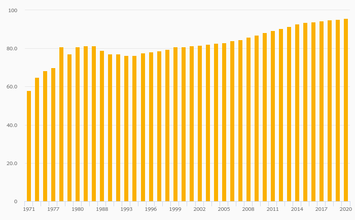 Girls to Boys In Primary and Secondary Education rose 0.596% to 95.7% in Laos in 2020