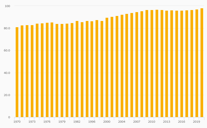 Girls to Boys In Primary and Secondary Education rose 0.899% to 98.1% in Guatemala in 2020