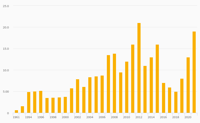 Wine Consumption (Total) rose 46.2% to 19.0 Ml in Ghana in 2021