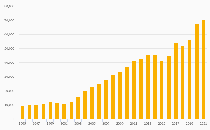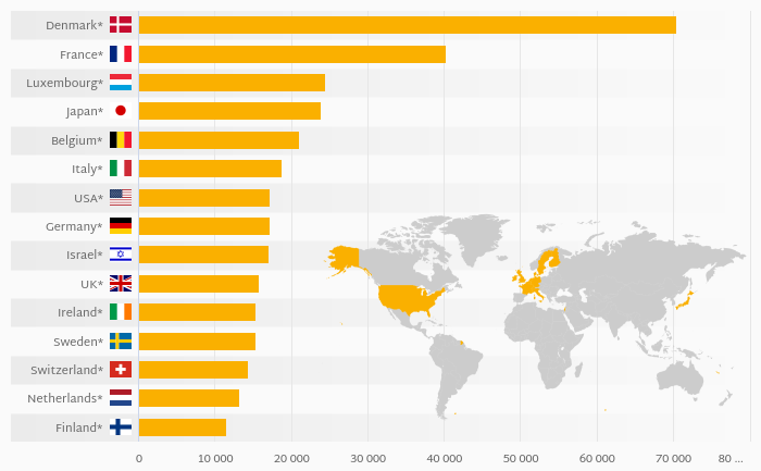 Households' Assets In Life Insurance Reserves Per Capita (USD) rose 4.91% to USD 70,511 in Denmark in 2021