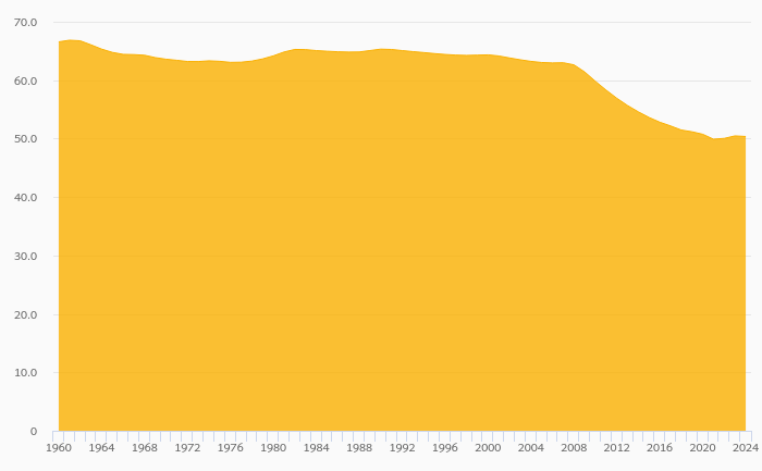 Population Aged 15-64 Years (As % of Total Population) fell 0.204% to 50.4% in Monaco in 2024
