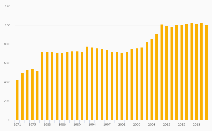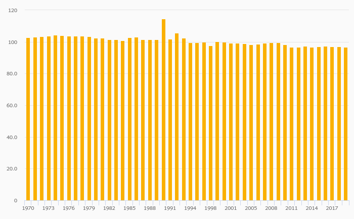 Girls to Boys In Primary and Secondary Education fell 0.421% to 101% in Colombia in 2020